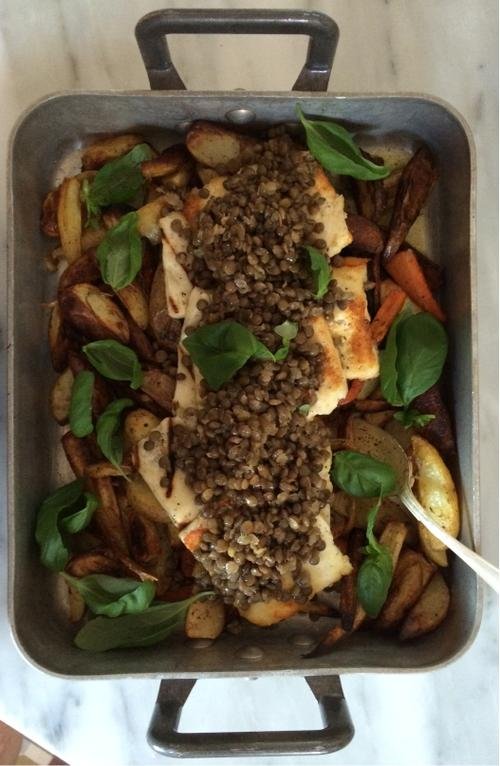 Sätt ugnen på 225 grader. Tvätta potatisen noga och torka den torr. Skala rotfrukterna. Skär allt i klyftor. Häll på olja. Mycket olja ger krispigare men onyttigare grönsaker. Blanda om och krydda med salt och kryddor. Baka i 30-40 min tills de är mjuka med fin färg. Rör om en gång under tiden. Koka ev. linserna eller spola av dem i kallt vatten om du använder burklinser. Blanda samman övriga ingredienser till dressingen och vänd ner linserna. Stek halloumin. Servera rotfrukterna med halloumi och linser. Garnera med färska örter om du har och servera gärna en yoghurtsås till.