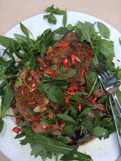 Ta ut köttet och låt det svalna något. Pensla med karamellsåsen. Köttsaften och såsen som rinner ner på plåten och blir över blandas till en god sås som du skrapar ner och serverar till eller häll över salladen. Låt köttet vila ca 10 min innan du skivar det tunt. Godast är köttet ljummet men även kallt smakar det bra. Strö över rejält med färska örter, ev. lite hackad chili och strimlade limeblad