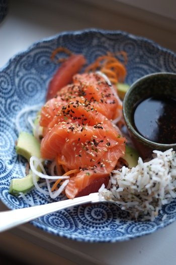 För att få till sashimin så krävs det att du köper Salma-lax. Om du vet att laxen är pinfärsk kan du självklart köpa vanlig odlad lax men ofta tycker jag den smakar alldeles för mycket tran och fisk. Jag hoppar hellre över några gånger än äter dålig lax och tycker att Salma definitivt är värt sina extra kronor.