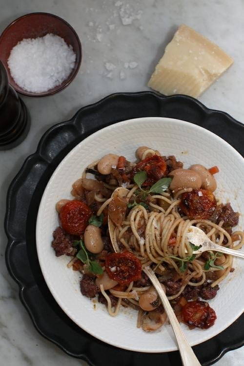 Jag kunde alltså ha haft i tomaterna i såsen när jag kokade den men jag kände inte för det. Dels så tyckte jag inte att de var tillräckligt söta och sen ville jag inte ha en tomatig pastasås (se ovan). Jag ville ha en köttig grönsaksstinn ragu med tomatinslag. Min lösning på ett sådant banalt problem blev att torka tomaterna i ugn. När man torkar, eller semi-torkar tomater, på låg värme i ugnen blir de söta med en intensiv och underbar smak. Din lösning kanske blir att köpa semi – eller lätt torkade körsbärstomater på burk. Det är antagligen mer miljövänligt men jag tror att mitt recept vinner i smak. Både Zeta och Matic har torkade körsbärstomater i sitt sortiment som inte alls är så umami-stinna som vanliga “sol-torkade” tomater annars kan vara.