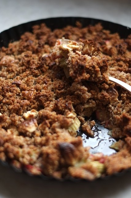 Rabarbersmulpaj med vit choklad och hasselnöt