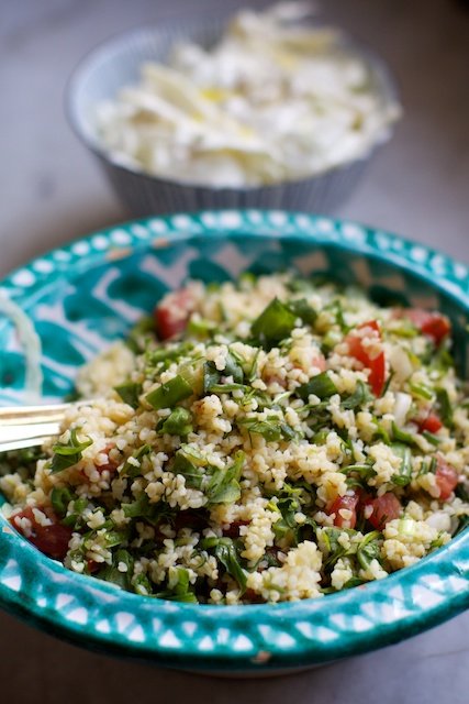 Vanligtvis görs tabouleh med en herrans massa finhackad persilja och mynta. Det här blir en god variant med rucola och dill. Köp gärna rucola på påse eller i kruka då den oftast är mildare än den i tråg.
