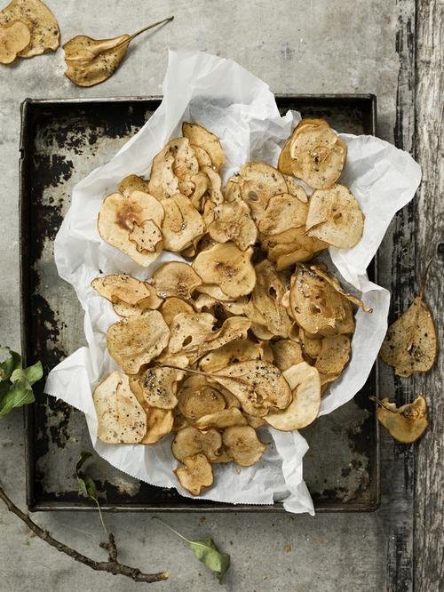 Torkade päronchips är gott som snacks, blir fint på tårtan eller är ett knaprigt inlägg i salladen. Torktiden varierar beroende på hur tunt du har skurit chipsen.