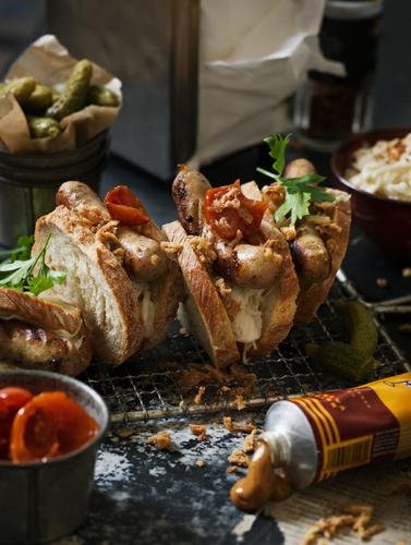 Skär baguetten i ”korvbröd” genom att skära ett snitt ¾ del genom brödet och därefter skära ett nytt snitt hela vägen ner. Krama ur surkålen och blanda med majonnäsen. Smaka av med peppar. Stek korvarna i lite olja. Lägg en klick surkålsmajonnäs i brödet, lägg i en korv och toppa med cornichons, tomater och friterad lök. Garnera med bladpersilja.
