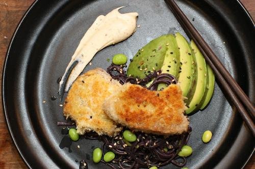 Blanda mirin och risvinäger. Smaka av med lite salt eller ännu hellre lite japansk soja. Tina edamamebönorna och koka risnudlarna enligt anvisning på förpackningen. Blanda majonnäsen med chilipepparblandningen och ställ kallt. Vispa upp ägget. Salta fisken och vänd den i mjöl, ägg och sist panko. Stek den lätt i olja på hög temperatur, ca 30 sekunder per sida eller tills ströbrödet är gyllenbrunt. Blanda risnudlarna med vinägerblandningen och sojabönorna och lägg på tallriken med majonnäs och avokado. Strö över furikake. Slut ögonen och dröm att du är i Japan!
