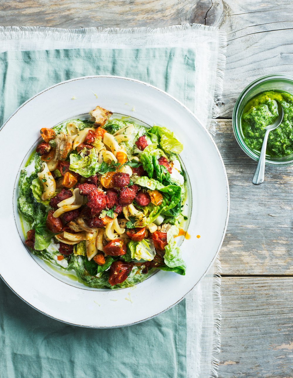 7. Blanda hälften av peston med yoghurt och lägg på ett fat. Varva salladsblad och pastablandningen på faten. Toppa med krutongerna och lite färska örter.