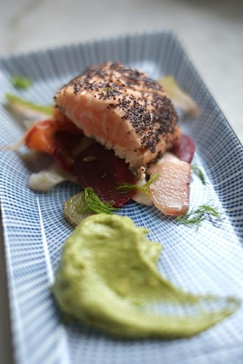 Avokado och vanilj är en match made in heaven precis om jag tycker att rabarber passar väldigt bra ihop med fänkål och lakrits. Min tanke var att en syrlig sallad, en söt avokadokräm och en lättstekt lite knaprig lax skulle funka bra ihop i en vårig förrätt. Det gjorde det, men den som söker något goffigt får fortsätta leta. Det här är för dig som letar efter något krispigt, fräscht och nytt. Prova!