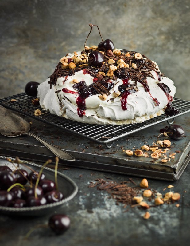 Traditonellt görs pavlovan på grädde och kiwifrukt men här har jag lånat smakerna från en annan klassisk dessert – Schwarzwald med körsbär, vanilj och bitter choklad. Men den historia drar vi en annan gång.