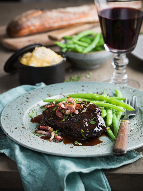 Men jag tänker att ni kanske behöver ett stärkande långkok? Ja, ni kanske behöver en stärkande ingefärsjuice också för att mota förkylningsolle i grinden men det behöver ni inte något recept på. Så åter till långkoket. Oxkinder är en prisvärd styckningsdel som inte är så vanlig. Kanske behöver du gå till en köttaffär eller så har du tur och hittar dem i en mataffär med välsorterad manuell köttdisk. De är inte alls svåra att tillaga men det kräver lite tålamod i form av tid. Du kan till och med låta ugnen göra jobbet medan du sover. Såsen blir mustig och smakrik och för att balansera den tycker jag det behövs något milt och krämigt. Gillar du inte polenta kan du ta potatismos men råris tycker jag blir för torrt. Och så självklart lite grönsaker till. Kokta (frysta) haricots verts, hårt rostad rödkål eller stekt brysselkål är några förslag. Sippsipp – slut på ingefärsjuicen.