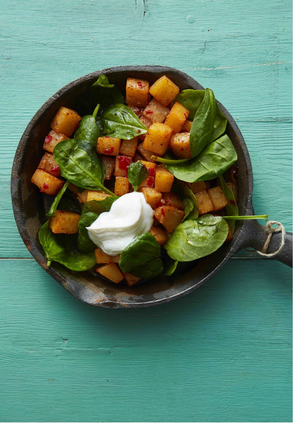 1 stor kålrot 1 röd chilipepparfrukt 1 vitlöksklyfta 1,5 msk lönnsirap 0,5 tsk kanel 50 g bladspenat smör till stekning salt yoghurt 10% till servering och 50 g rostade pekannötter eller hasselnötter