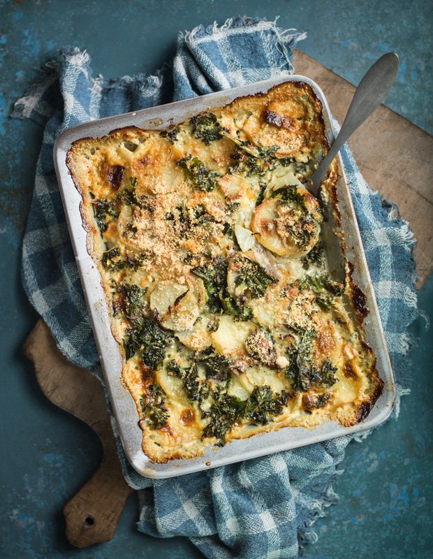 En grönare jul? En glutenfri Jansson? Här är lösningen på båda – en Jansson med grönkål och mandelmjöl.
